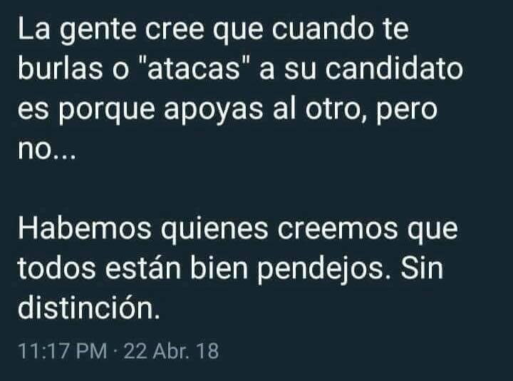 No, no todos los políticos son iguales, los hay buenos, los hay malos; los hay corruptos y los hay honestos, pero nuestra tarea es aprender a separarlos, porque aquello que despreciamos y odiamos, es lo que permite que los malos servidores sigan actuando en la impunidad y sin un castigo; es lo que aprueba que estudiantes sean asesinados; es lo que mantiene el régimen camine hacía la podredumbre total y acabe con el futuro de nuestros hijos.